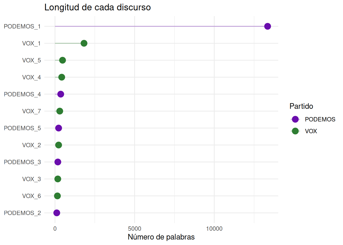 labs(title = "Longitud de cada discurso", x = NULL, y = "Número de palabras", fill = "Partido") +