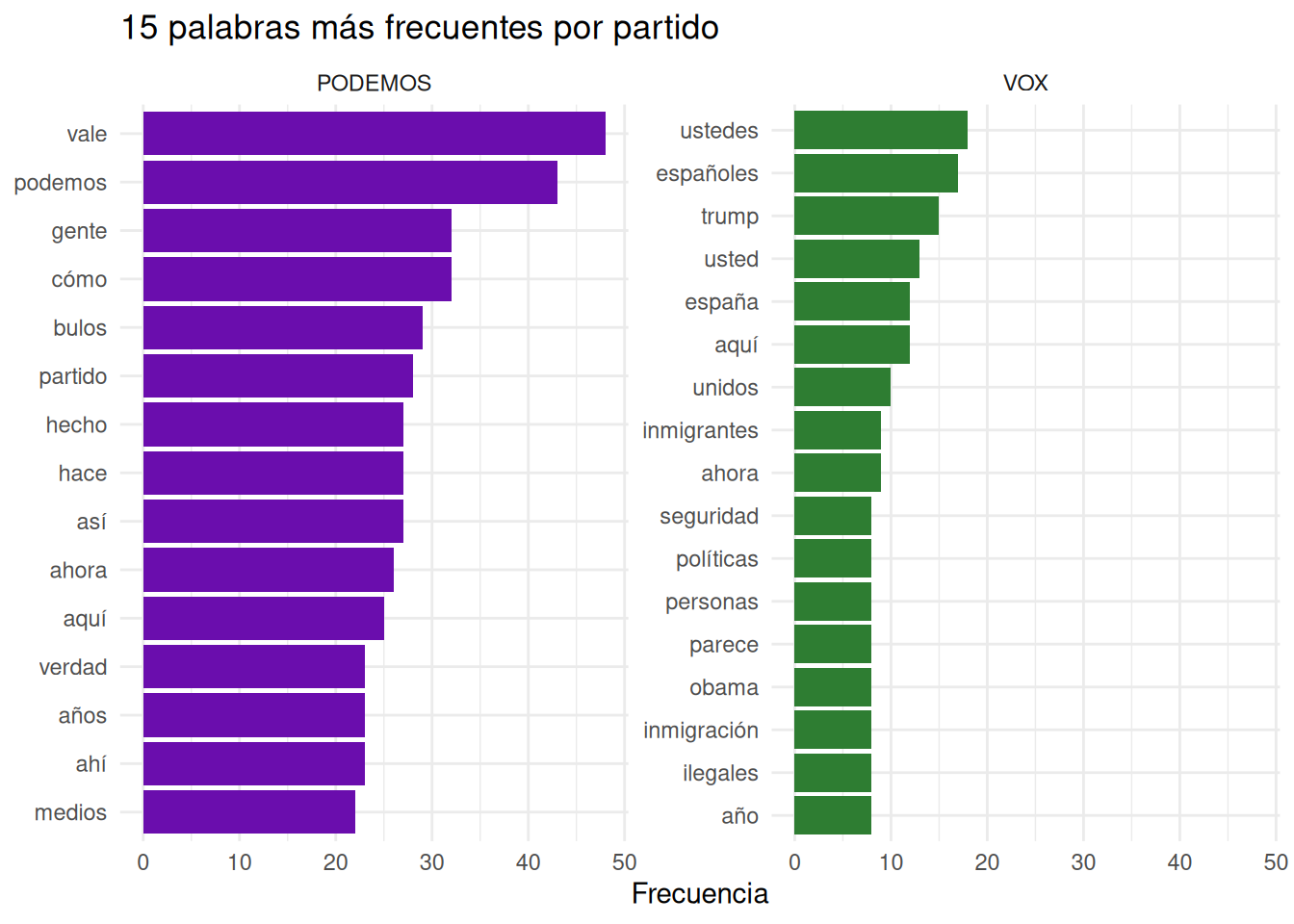 labs(title = "15 palabras más frecuentes por partido", x = NULL, y = "Frecuencia") +